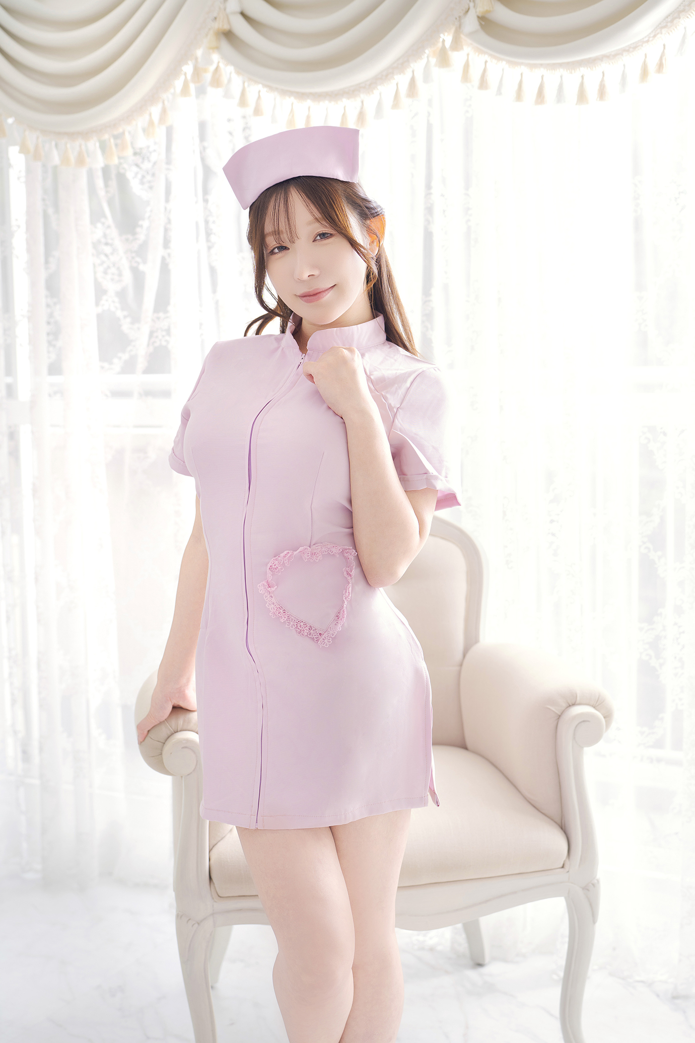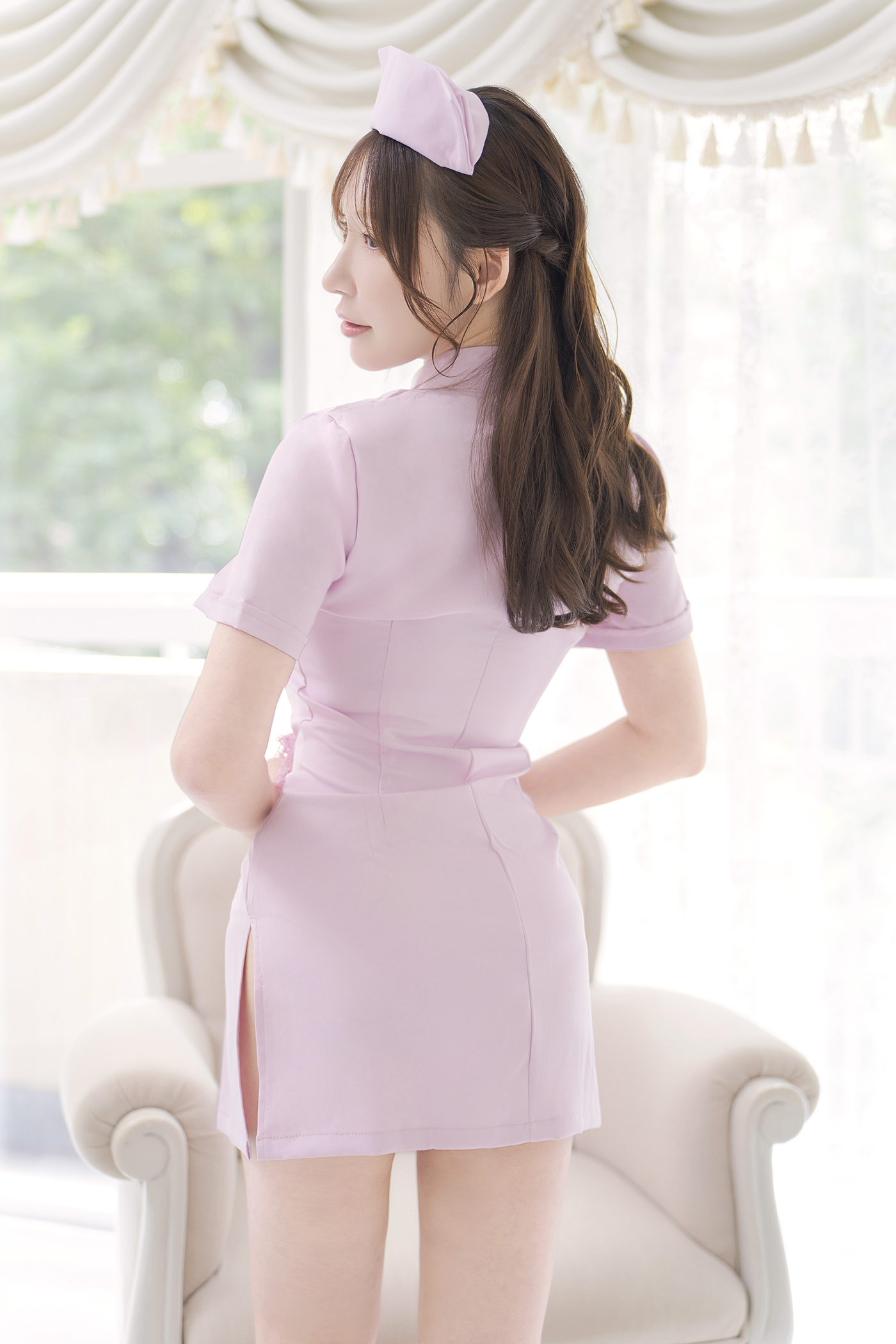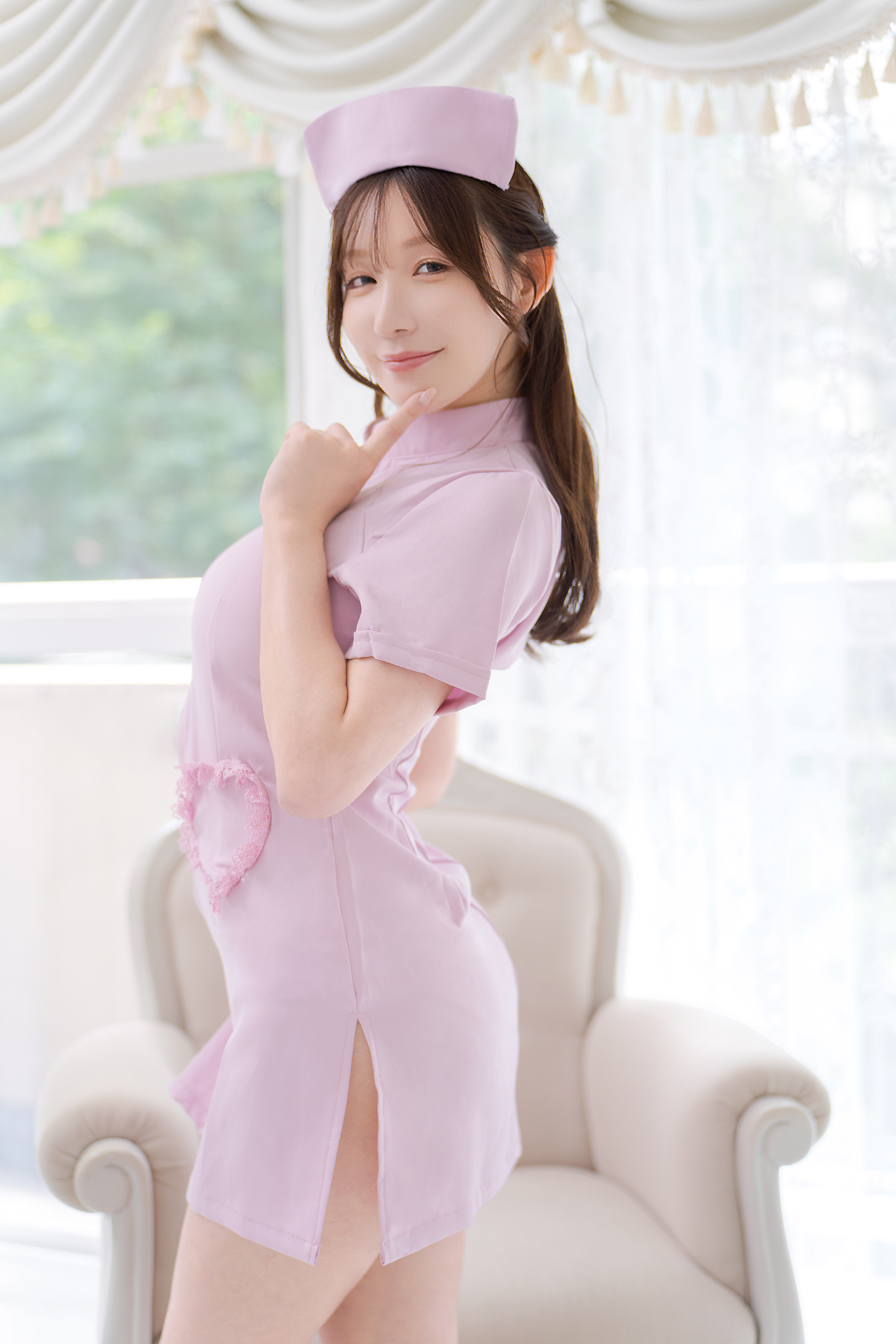 スリットで甘く誘惑♡ピンクナース。丈短め、スリット深めのナースコスで大胆に魅せる一着。