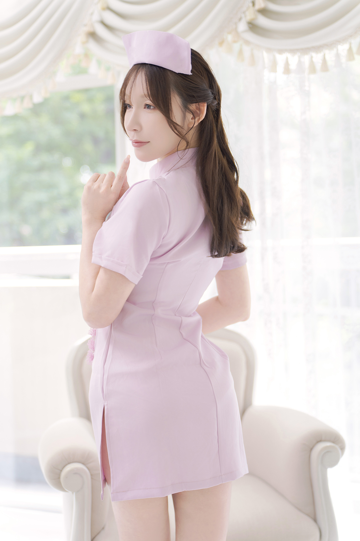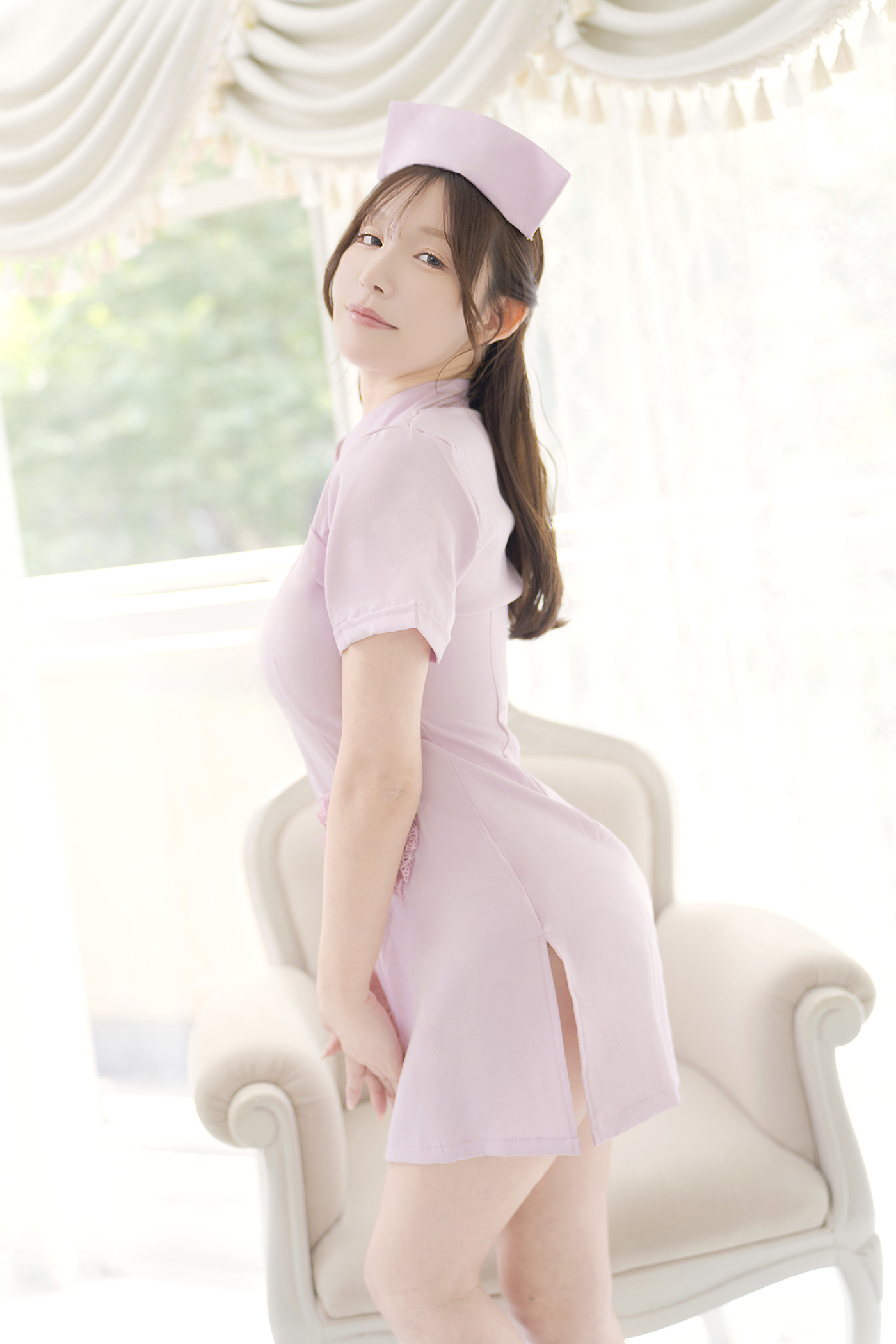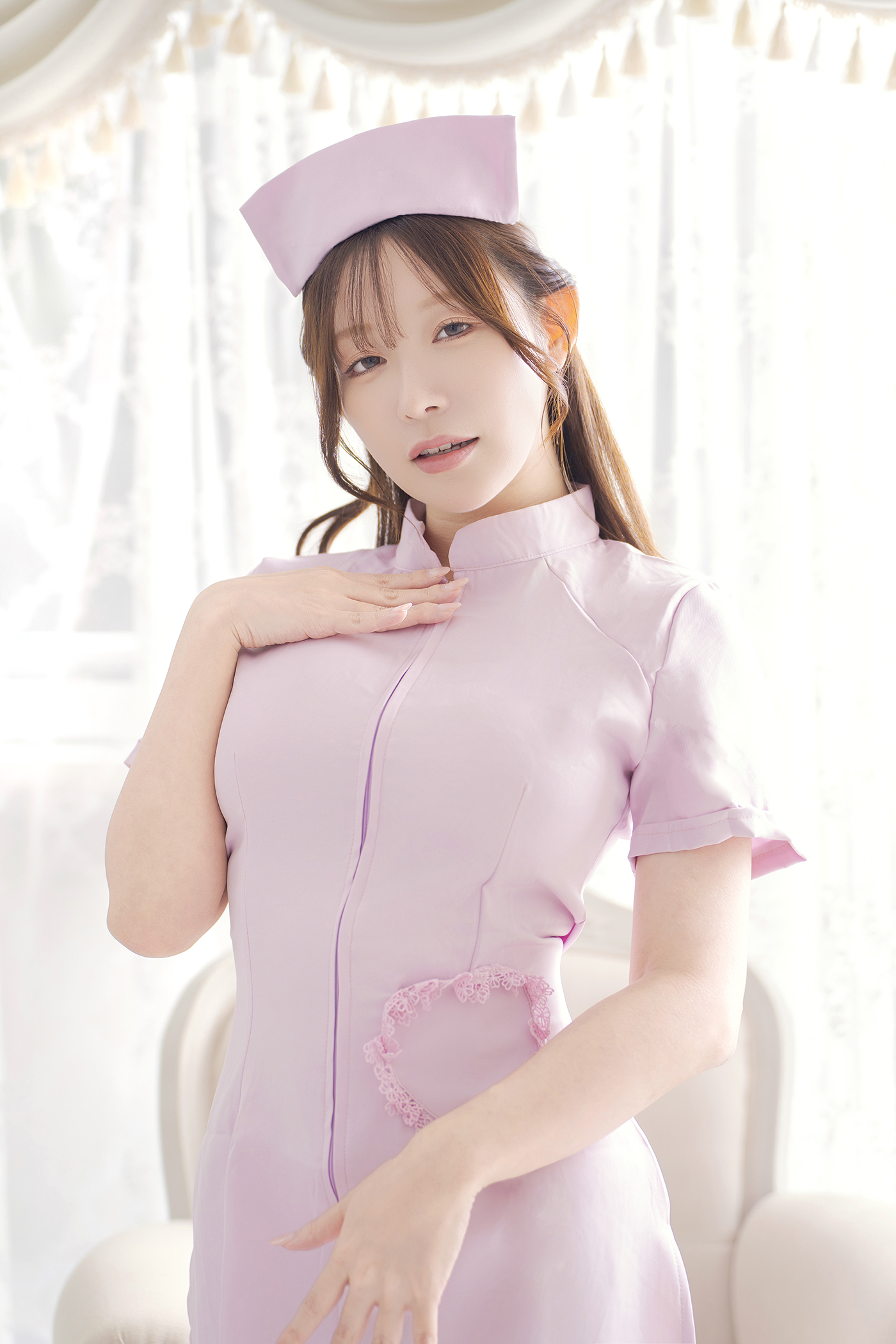 スリットで甘く誘惑♡ピンクナース。丈短め、スリット深めのナースコスで大胆に魅せる一着。